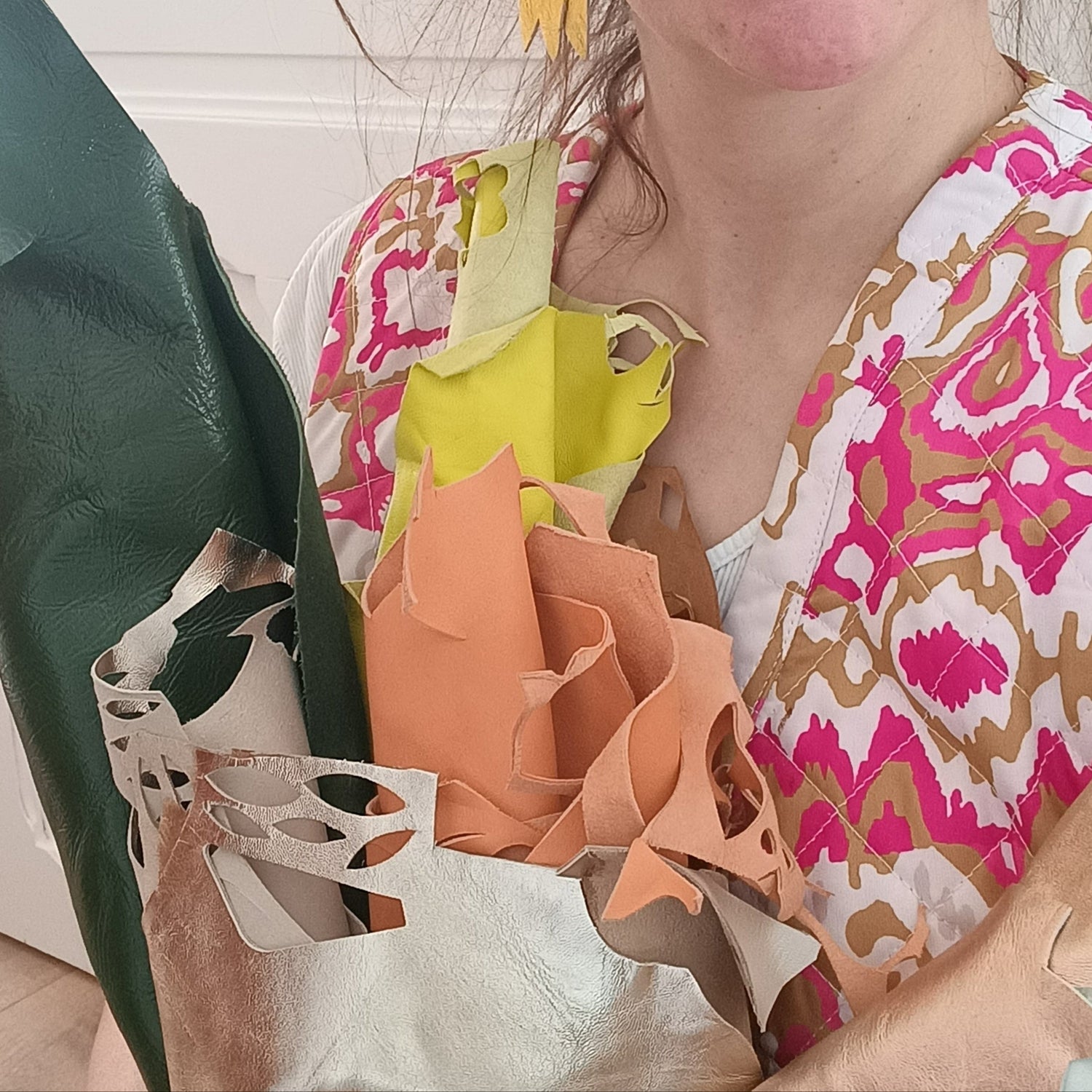 Ma matière première ? Le cuir recyclé. Je donne une seconde vie à ces chutes, créant des bijoux uniques, légers pour vous et pour la planète.